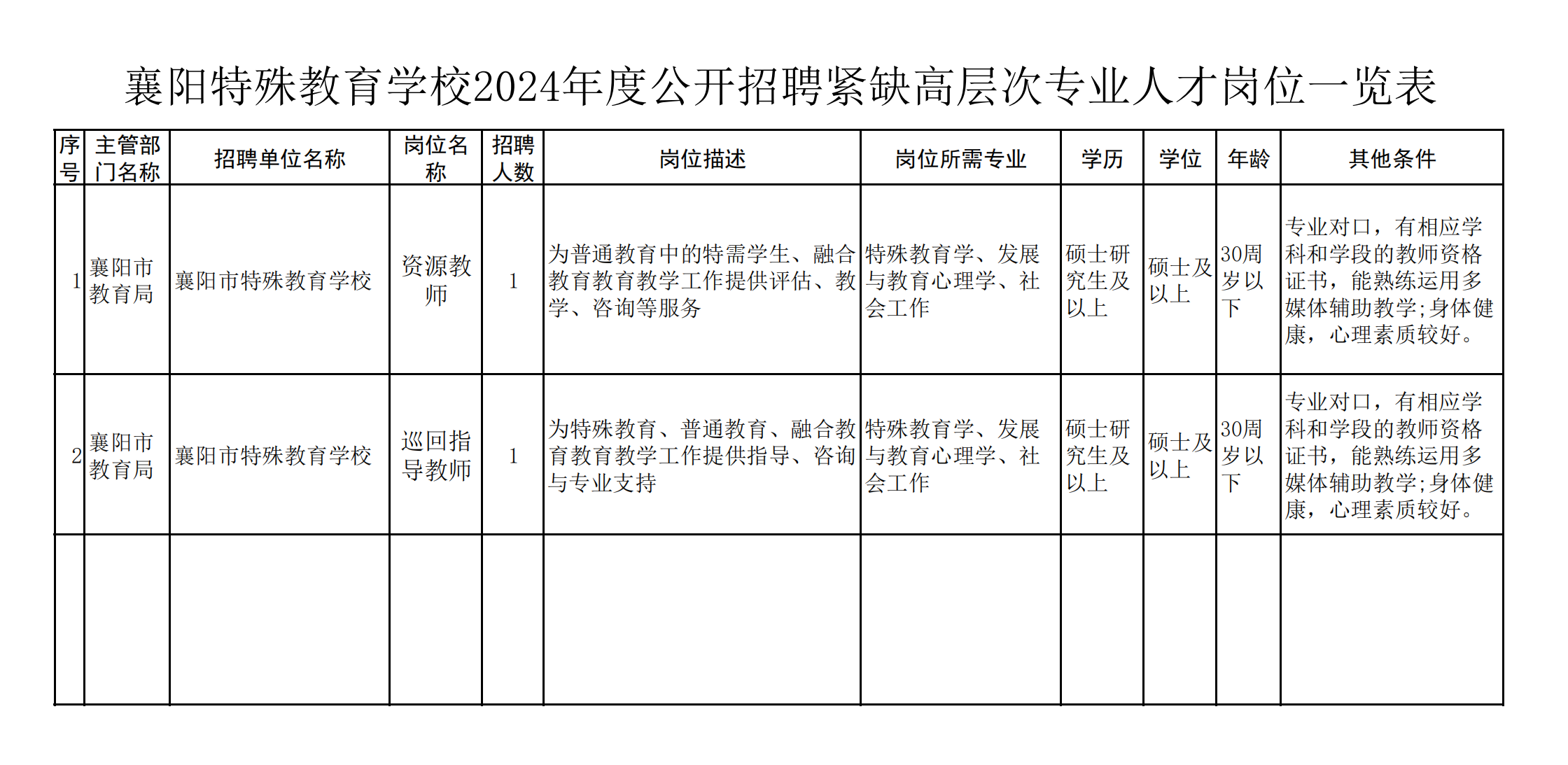 为推动全市特殊教育、融合教育改革发展,落实2024年《市教育局工作要点》推进市级特殊教育资源中心建设的任务,襄阳市特殊教育学校拟公开招聘紧缺高层次专业人才2名。岗位条件详情见《襄阳市特殊教育学校2024年度公开招聘紧缺高层次专业人才岗位表》。