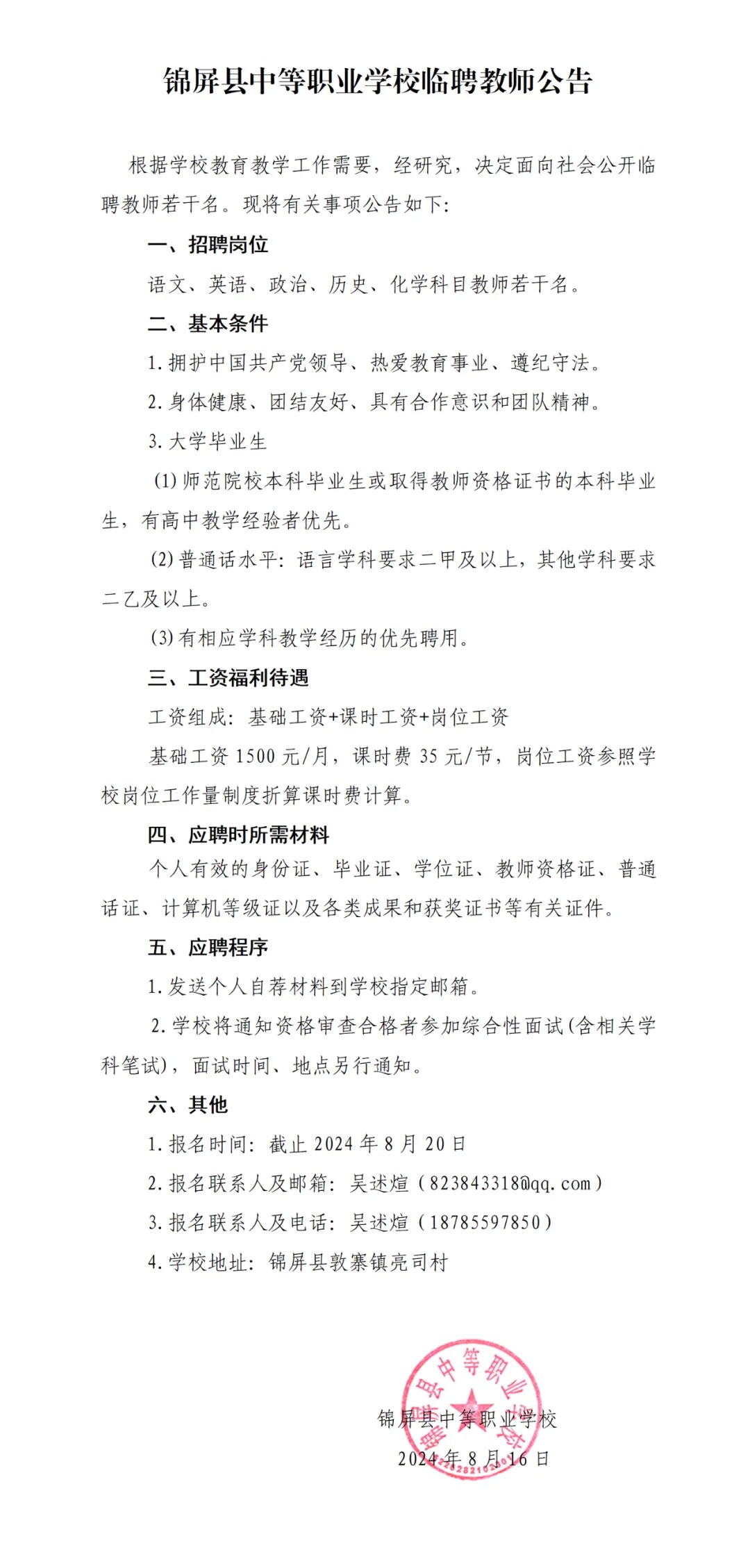 2024年黔东南锦屏县中等职业学校临聘教师公告