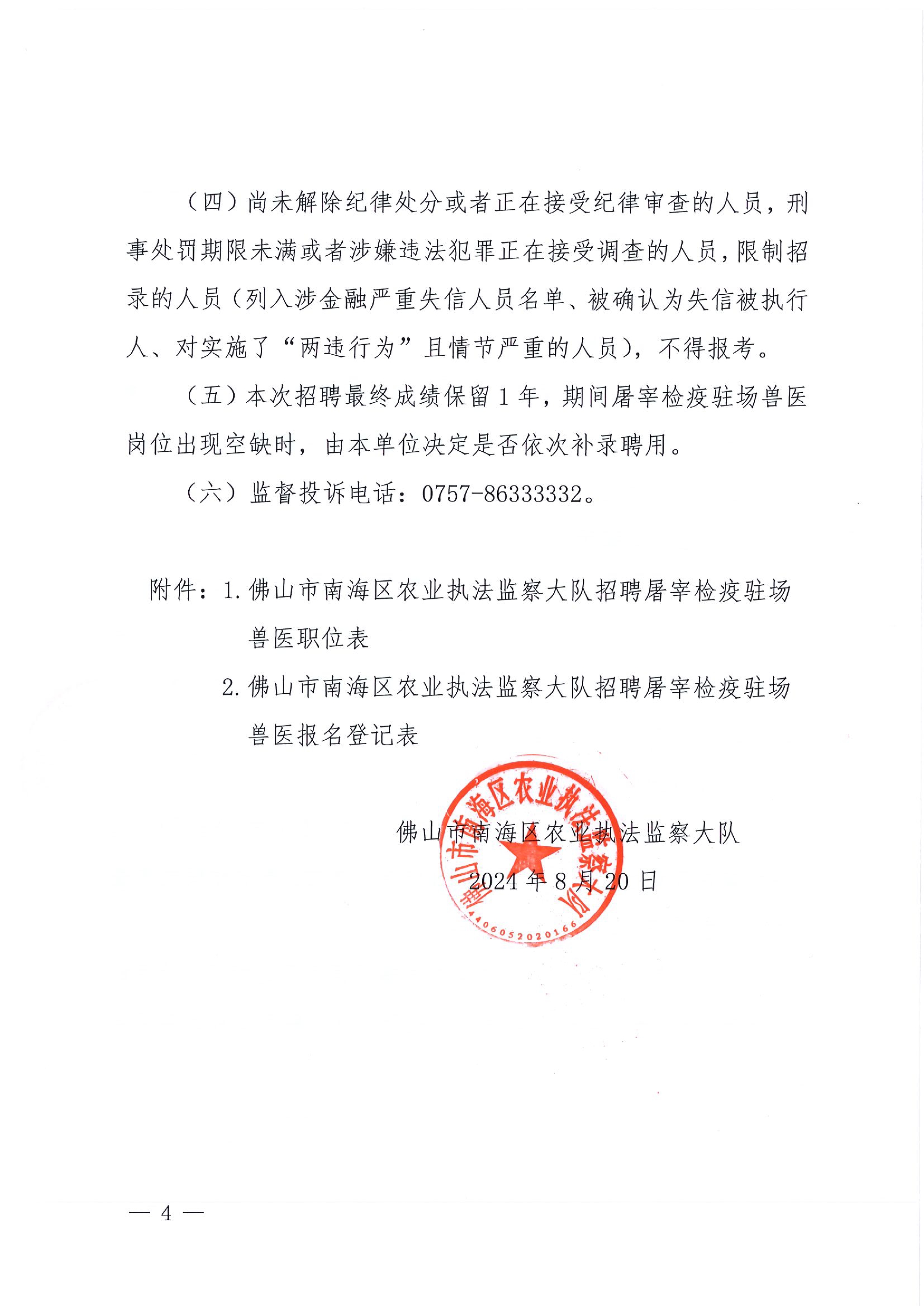 2024年佛山市南海区农业执法监察大队招聘屠宰检疫驻场兽医公告
