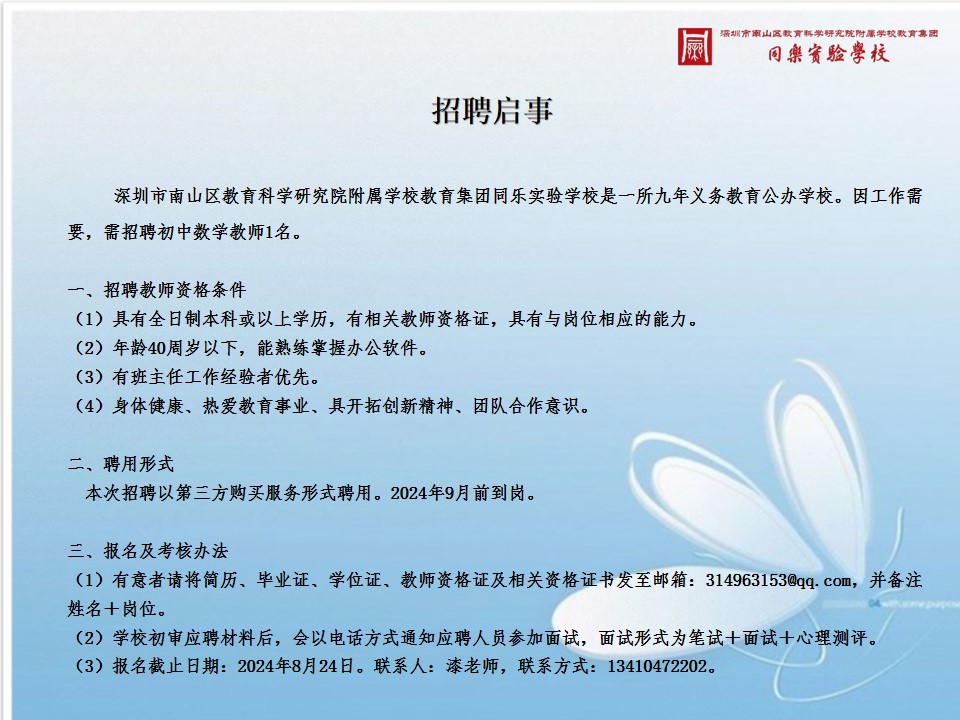 原标题:深圳市南山区教育科学研究院附属学校教育集团同乐实验学校公开招聘启事