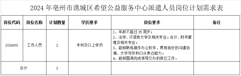 2024年亳州市谯城区希望公益服务中心招聘2人公告
