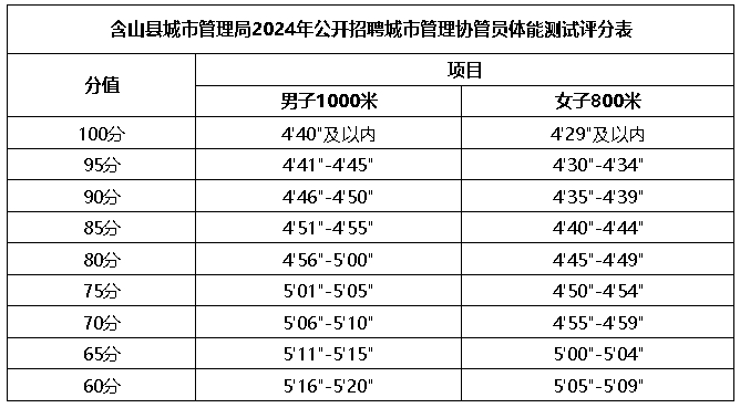 (5)体能测试成绩参考《含山县城市管理局2024年公开招聘城市管理协管员体能测试评分表》,体能测试成绩原则上不低于60分,若考生低于60分则不得进入下一环节。