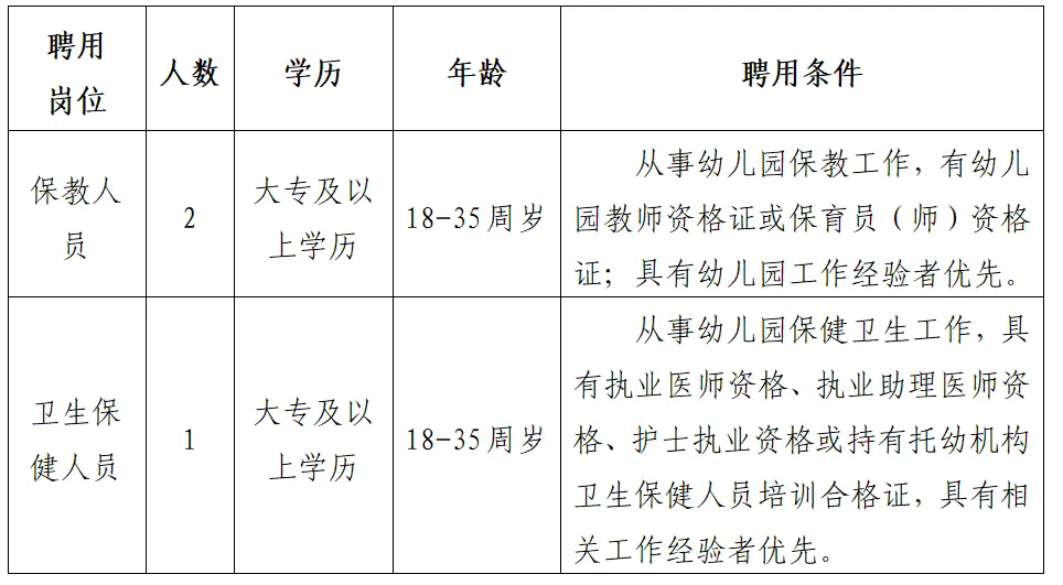 计划招聘保教人员(2名)、卫生保健人员(1名),共计3名,具体岗位要求如下: