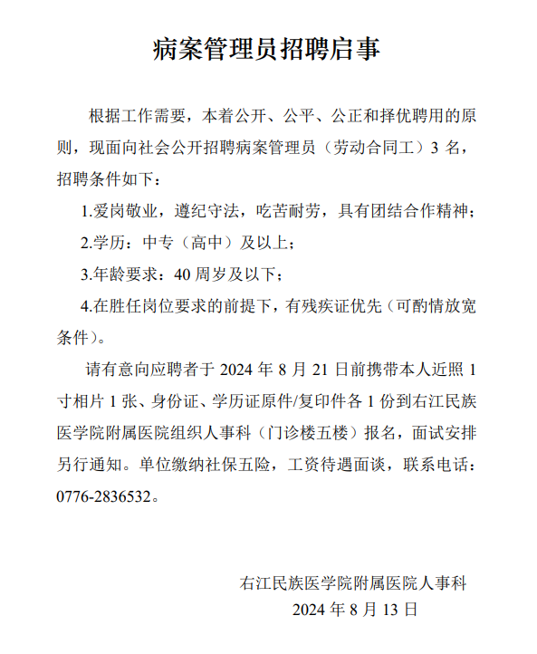 原标题:右江民族医学院附属医院病案管理员招聘启事