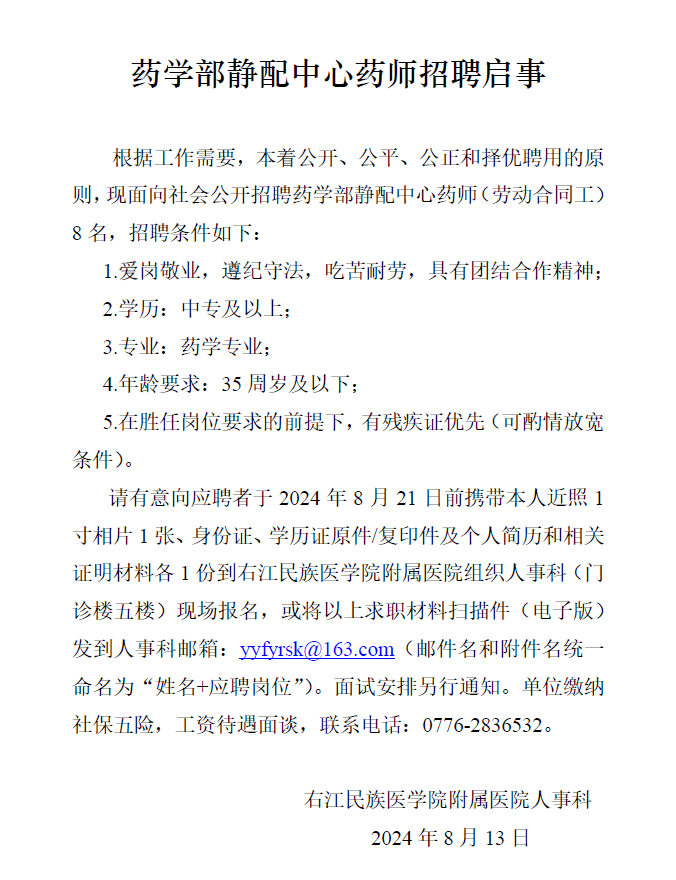 原标题:右江民族医学院附属医院药学部静配中心药师招聘启事