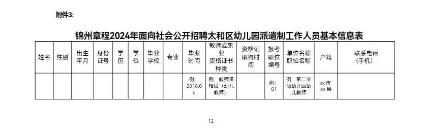 《锦州章程2024年面向社会公开招聘太和区幼儿园派遣制工作人员基本信息表》
