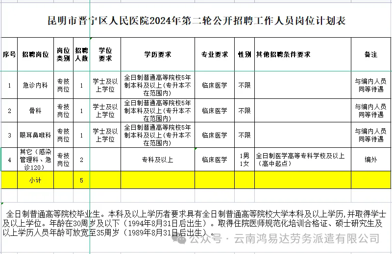 为加强医院发展步伐,提高医院整体功能,云南鸿易达劳务派遣有限公司根据晋宁区人民医院委托,面向社会公开招聘劳务派遣人员:5名,公告如下: