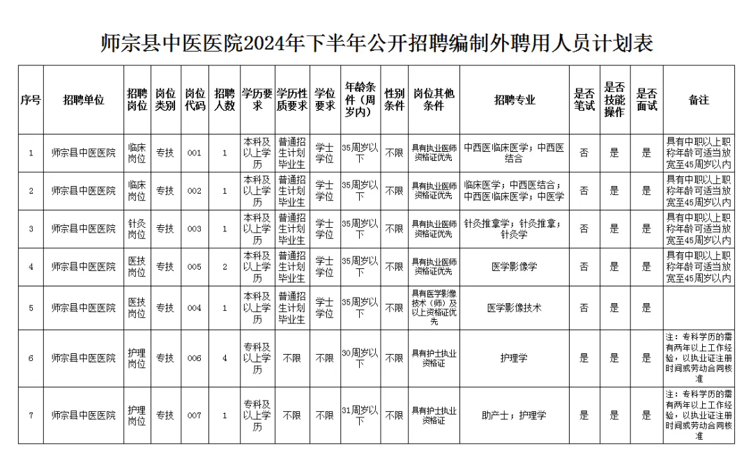 附件:1、师宗县中医医院2024年下半年公开招聘编制外聘用人员计划表