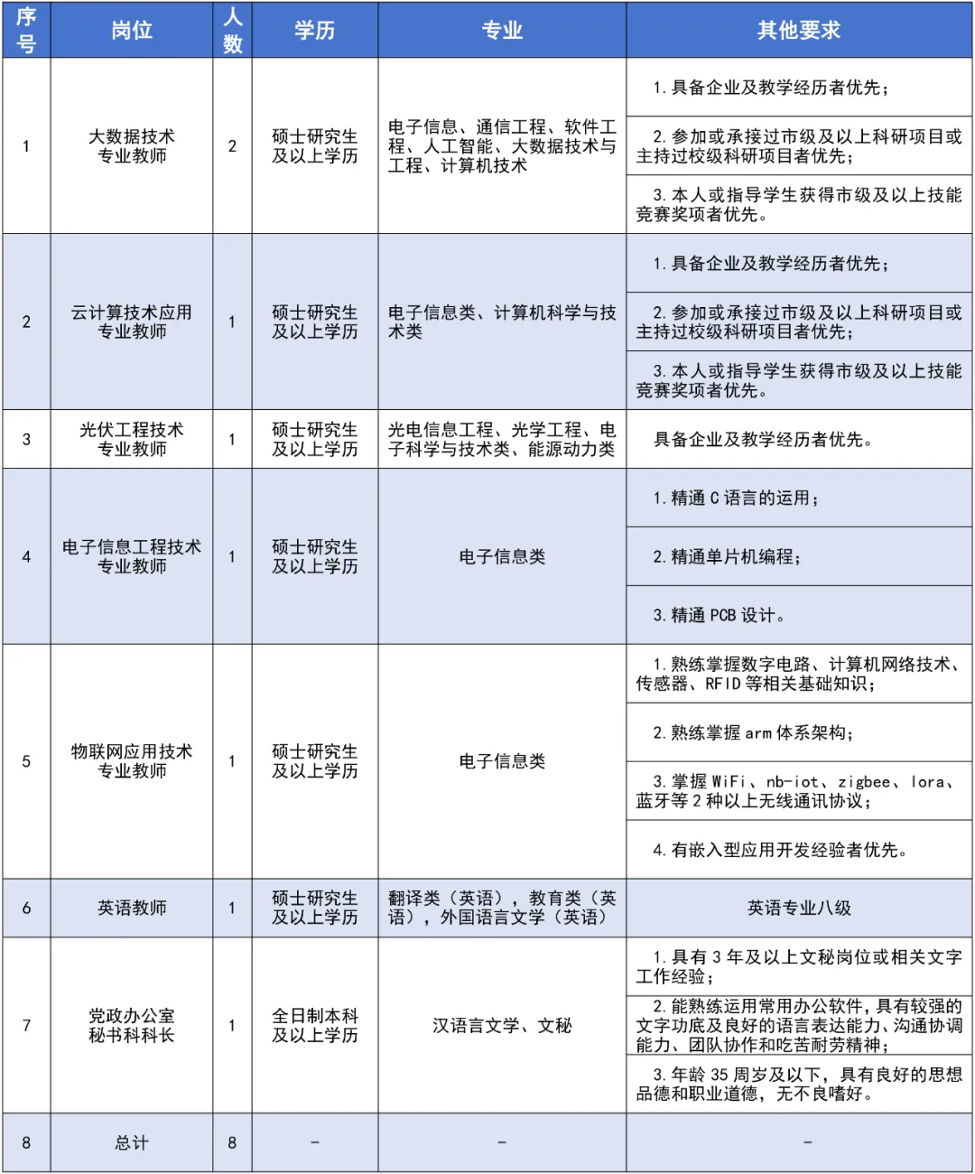 本次面向社会公开招聘专任教师7名,党政办公室秘书科科长1名,具体招聘岗位及要求详见下表。